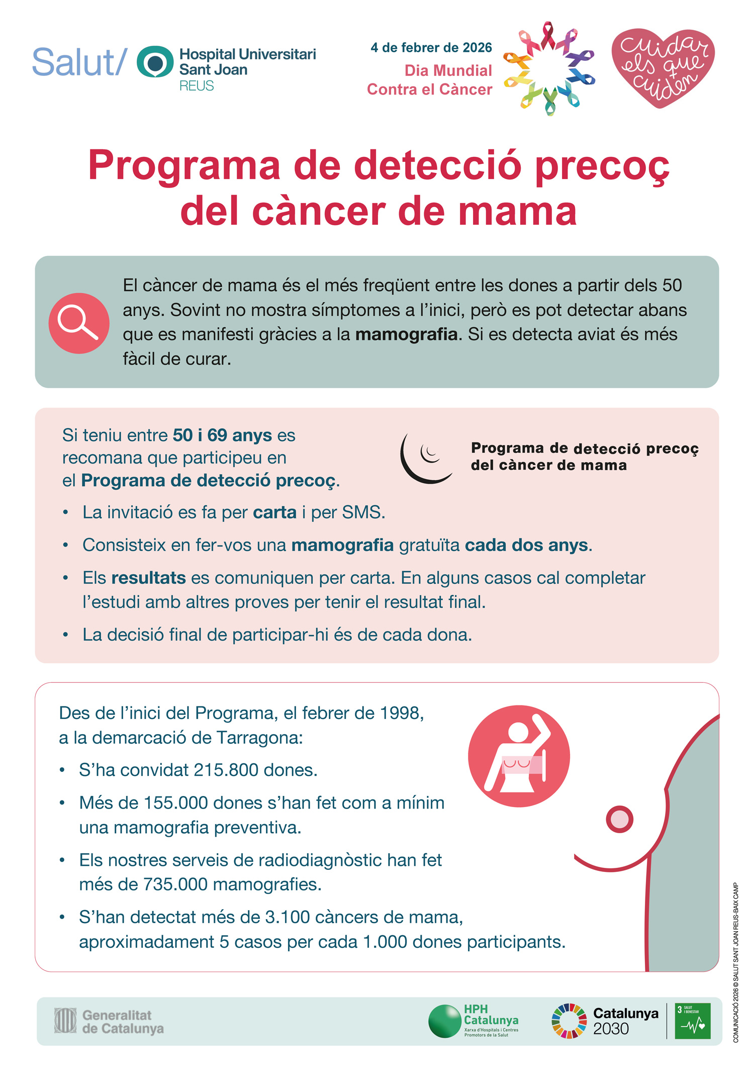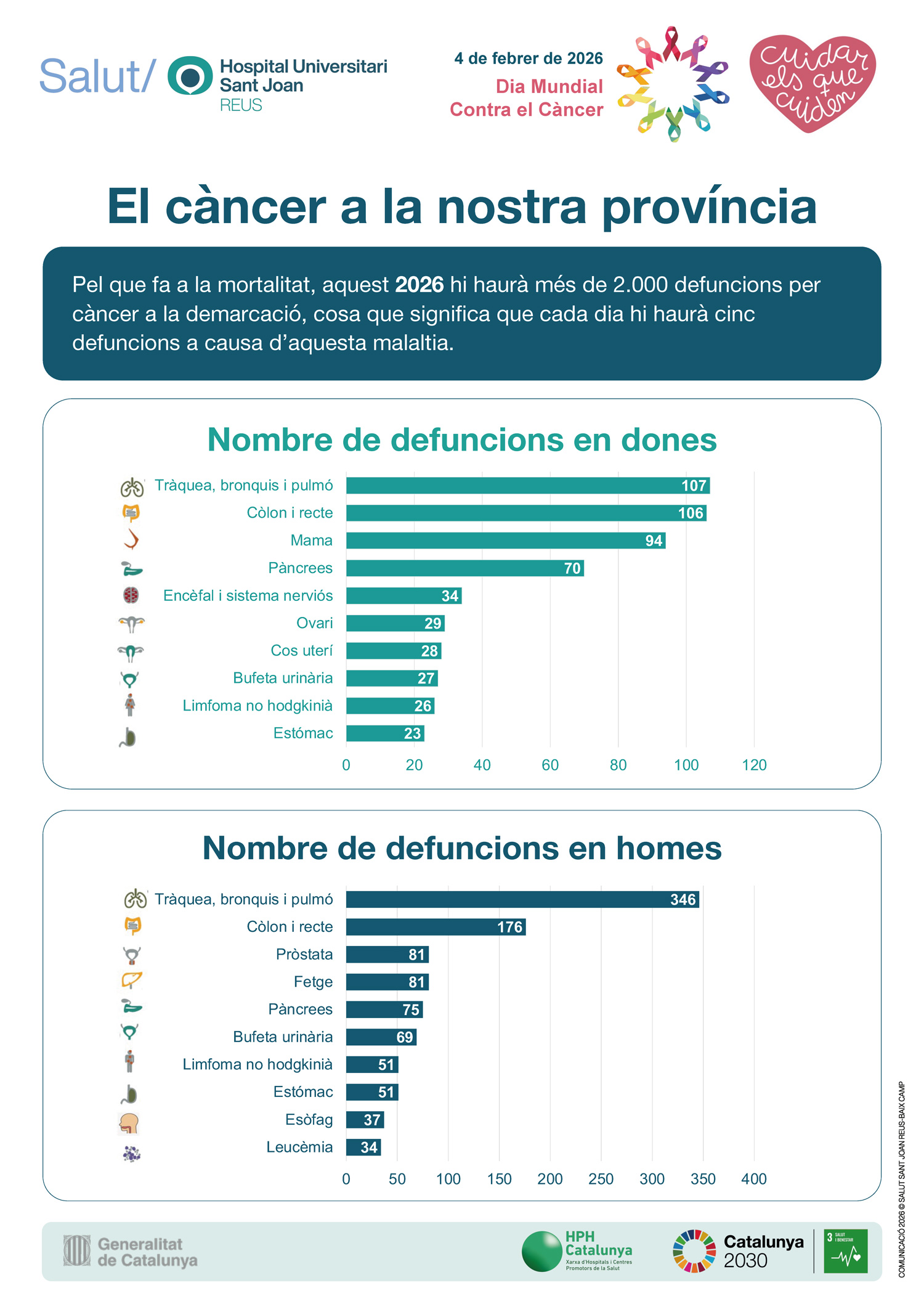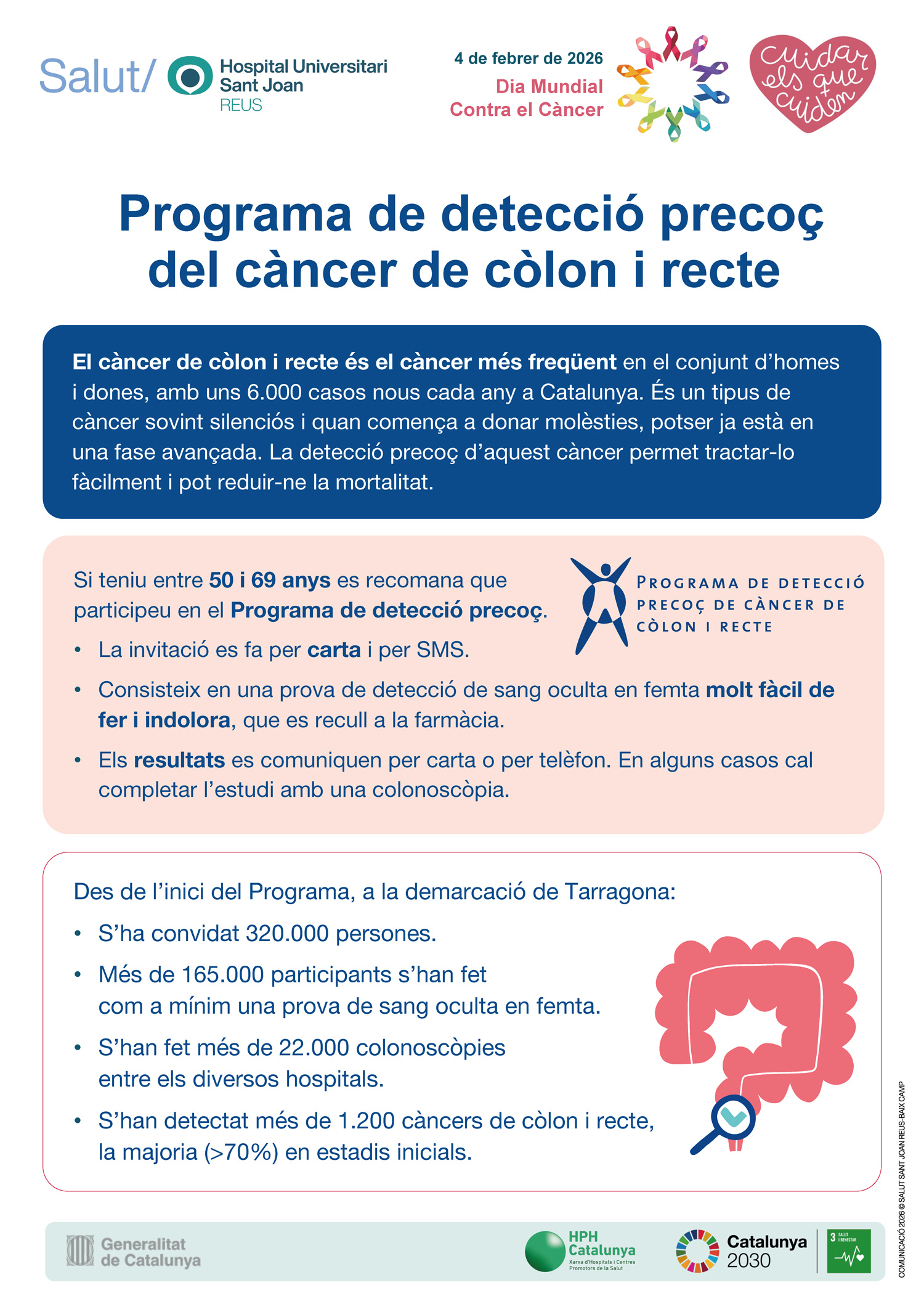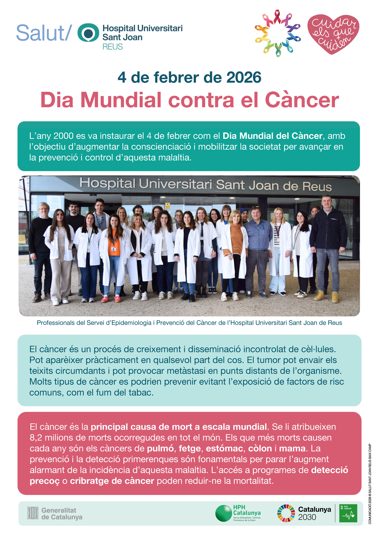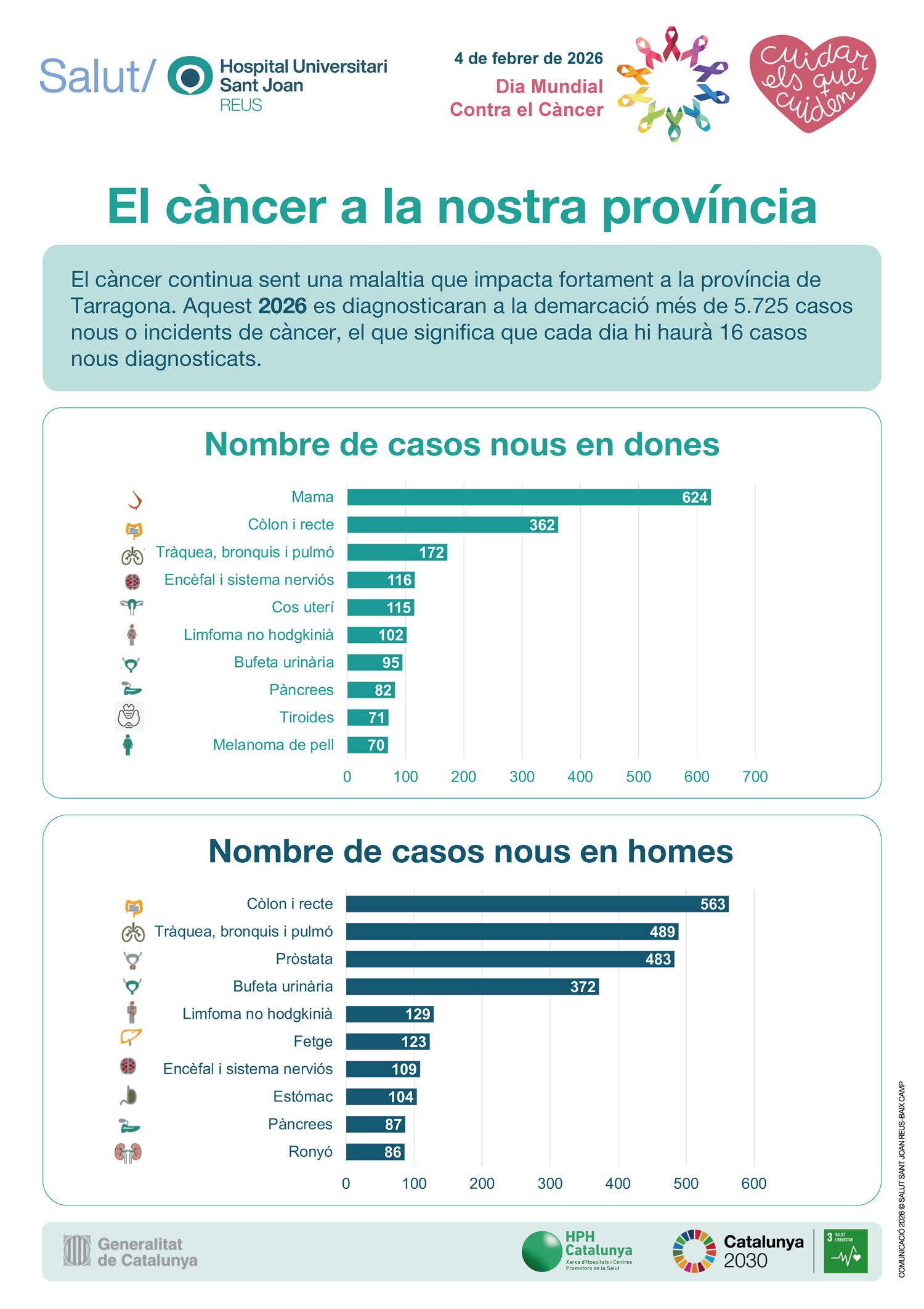 Coincidint amb el Dia Mundial contra el Càncer (4 de febrer), el Servei d'Epidemiologia i Prevenció del Càncer de l'Hospital Universitari Sant Joan de Reus alerta que aquest 2026 es diagnosticaran a la demarcació de Tarragona més de 5.725 casos nous de càncer. Aquesta xifra equival a una mitjana de 16 nous diagnòstics cada dia.