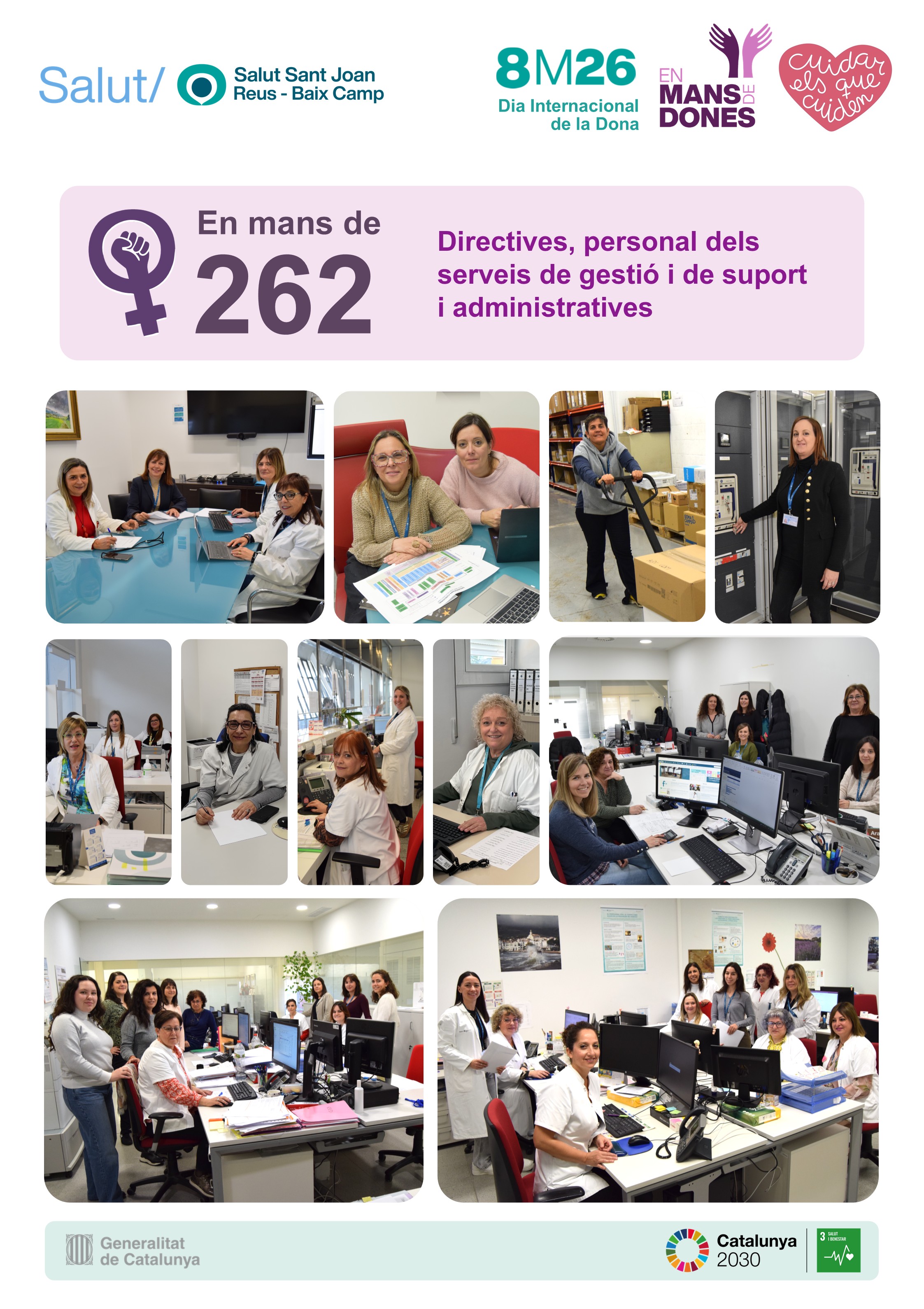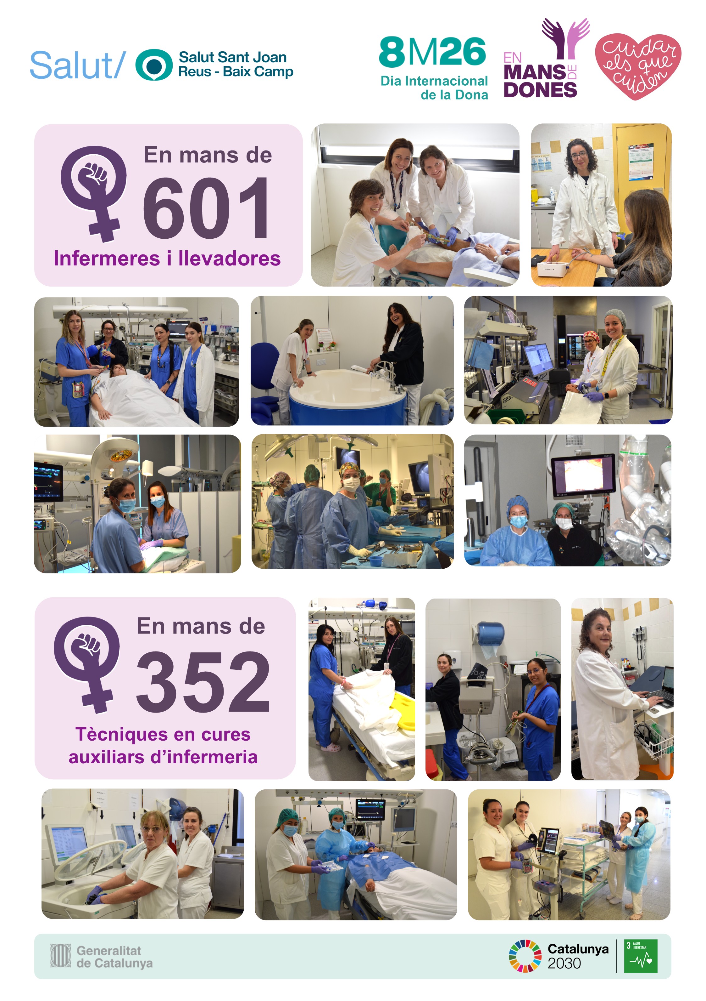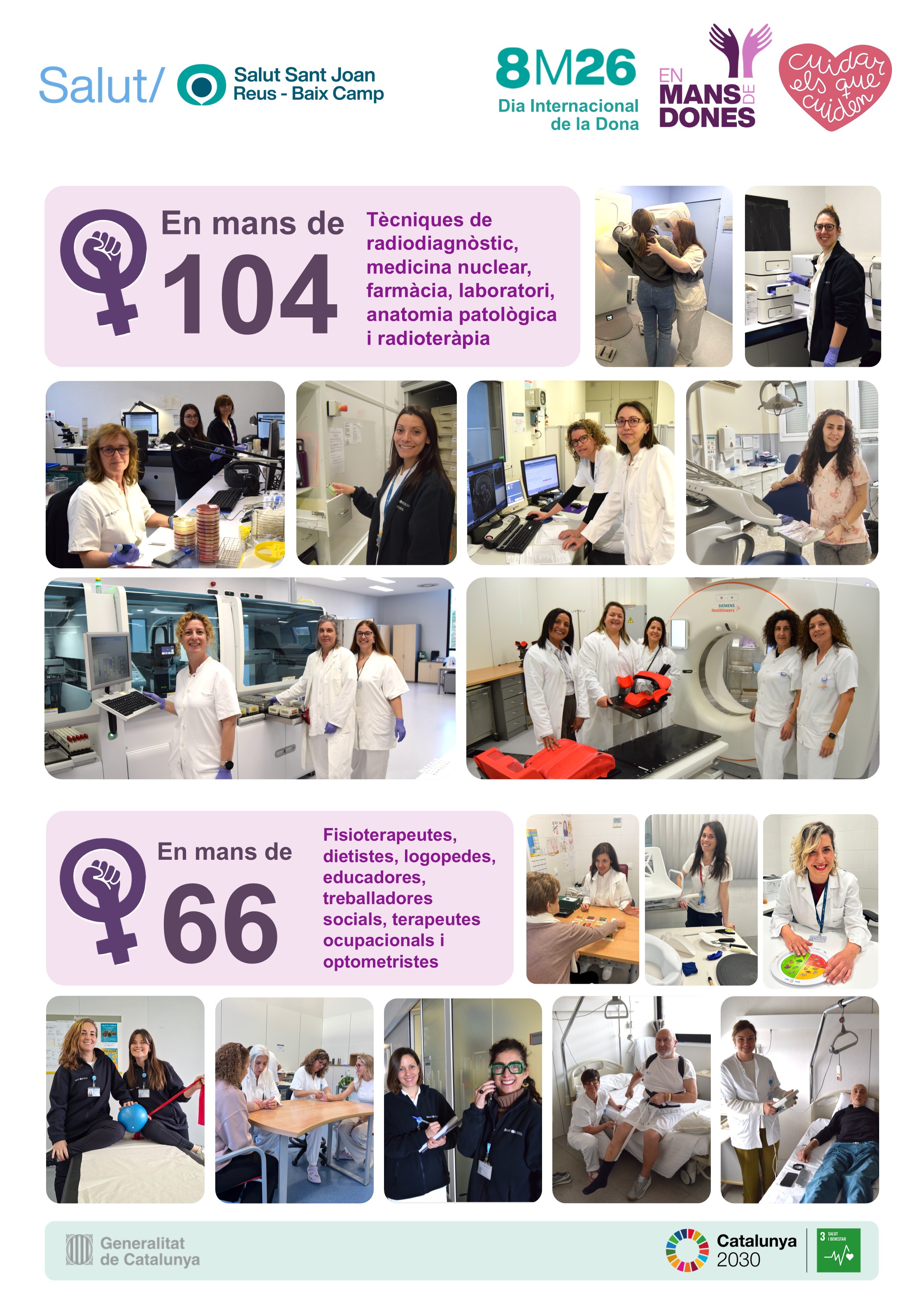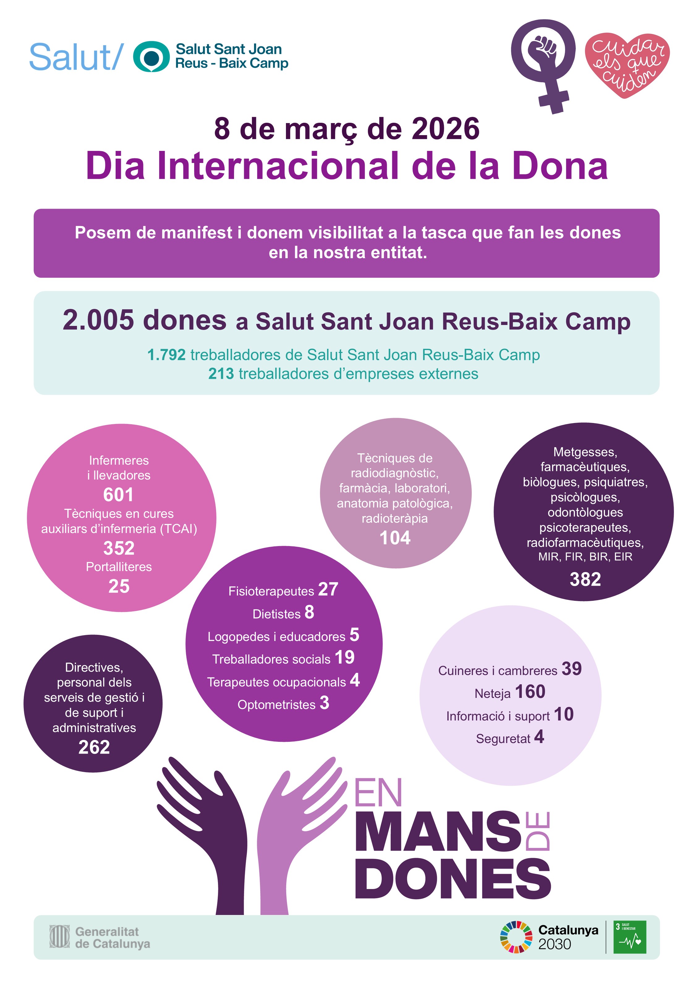 El 76% dels professionals de Salut Sant Joan Reus-Baix Camp són dones. És per això que amb el lema "En mans de dones" volem donar visibilitat a la feina que fan les 2.005 dones de la nostra entitat: les 1.792 dones de Salut Sant Joan, i les 213 que hi treballen contractades per empreses externes.