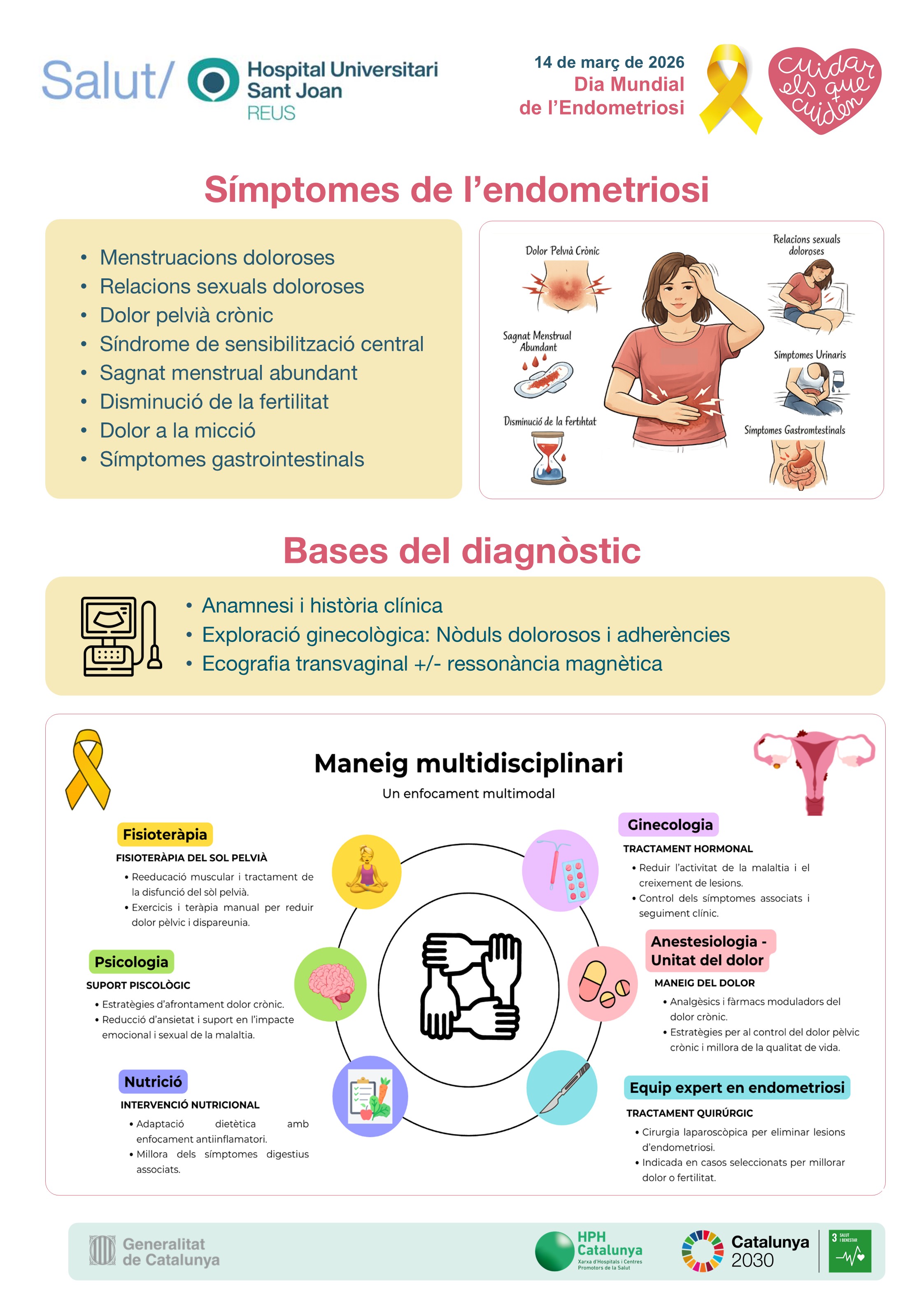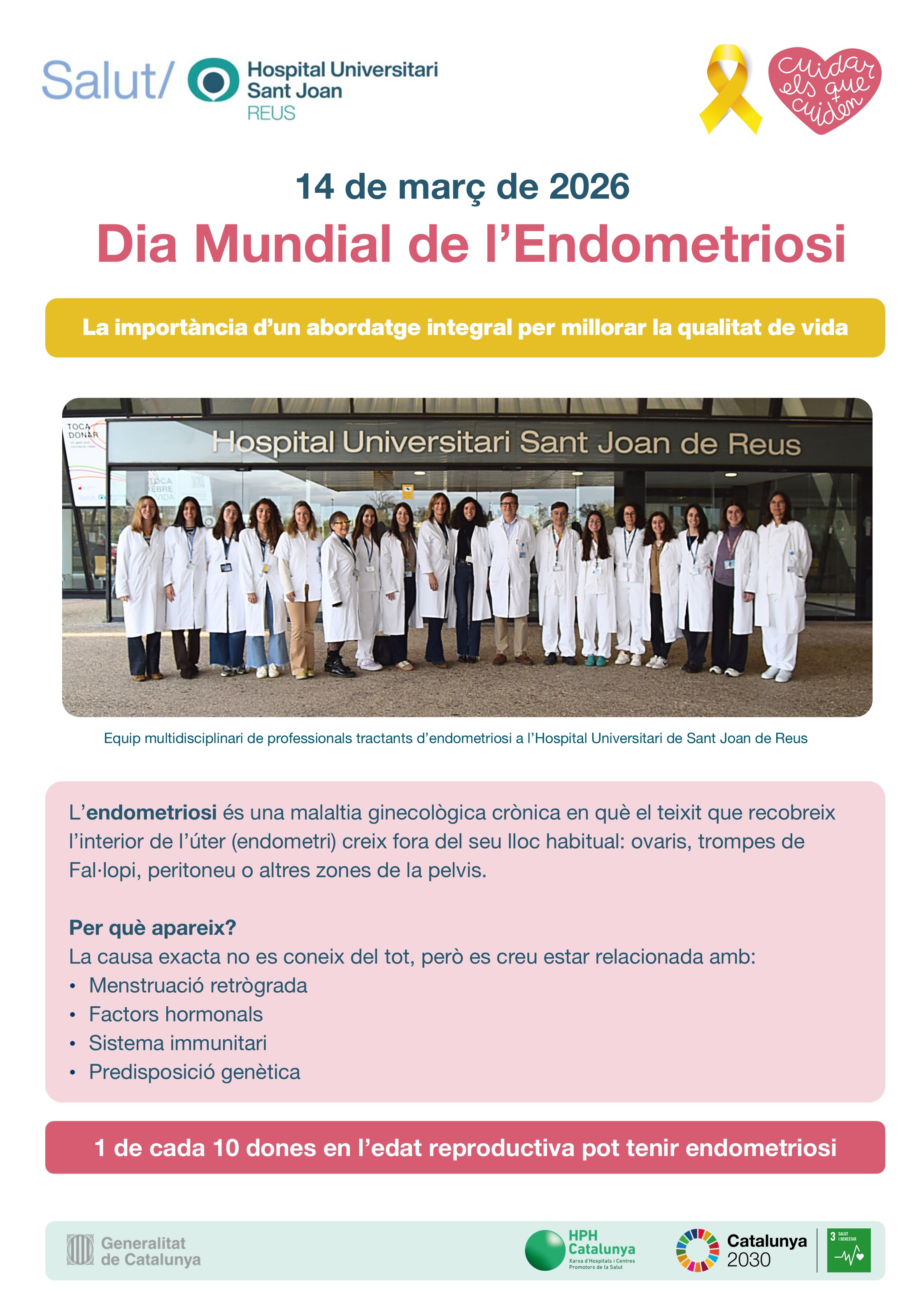 El Dia Mundial de l'Endometriosi, el 14 de març, té l'objectiu de visibilitzar aquesta malaltia, que tot i ser la patologia ginecològica més freqüent i que pateixen 1 de cada 10 dones en edat reproductiva, és encara desconeguda per a gran part de la població. Per commemorar la jornada, des del Servei d'Obstetrícia i Ginecologia de l'Hospital Universitari Sant Joan de Reus han preparat una exposició informativa que es podrà veure a la rambla del centre les pròximes setmanes.