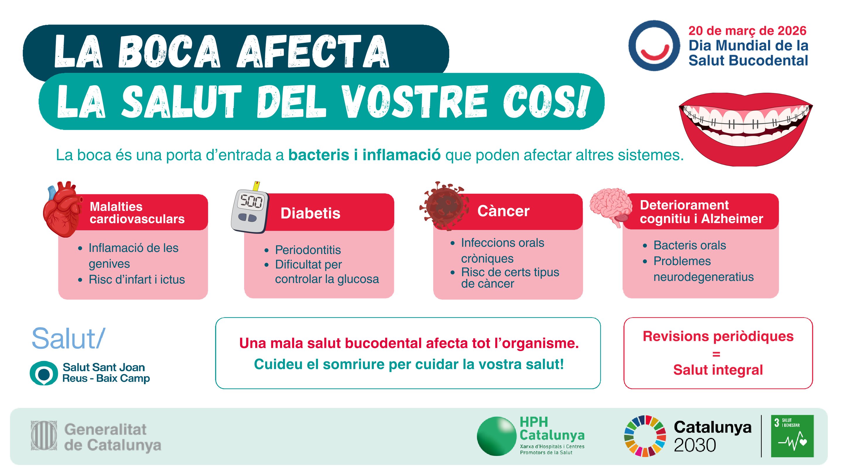 Per commemorar el Dia Mundial de la Salut Bucodental, el 20 de març, els equips d'odontologia i salut bucodental dels centres d'atenció primària de Salut Sant Joan Reus-Baix Camp projecten una infografia informativa de promoció de la salut bucodental a les pantalles de les sales d'espera, que ha preparat l'equip del CAP Marià Fortuny de Reus.