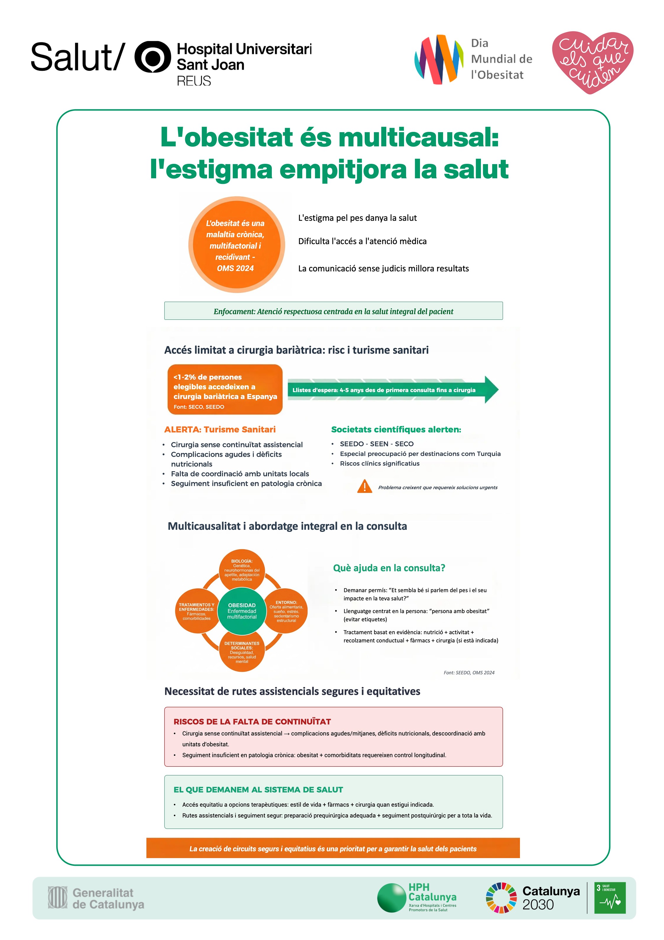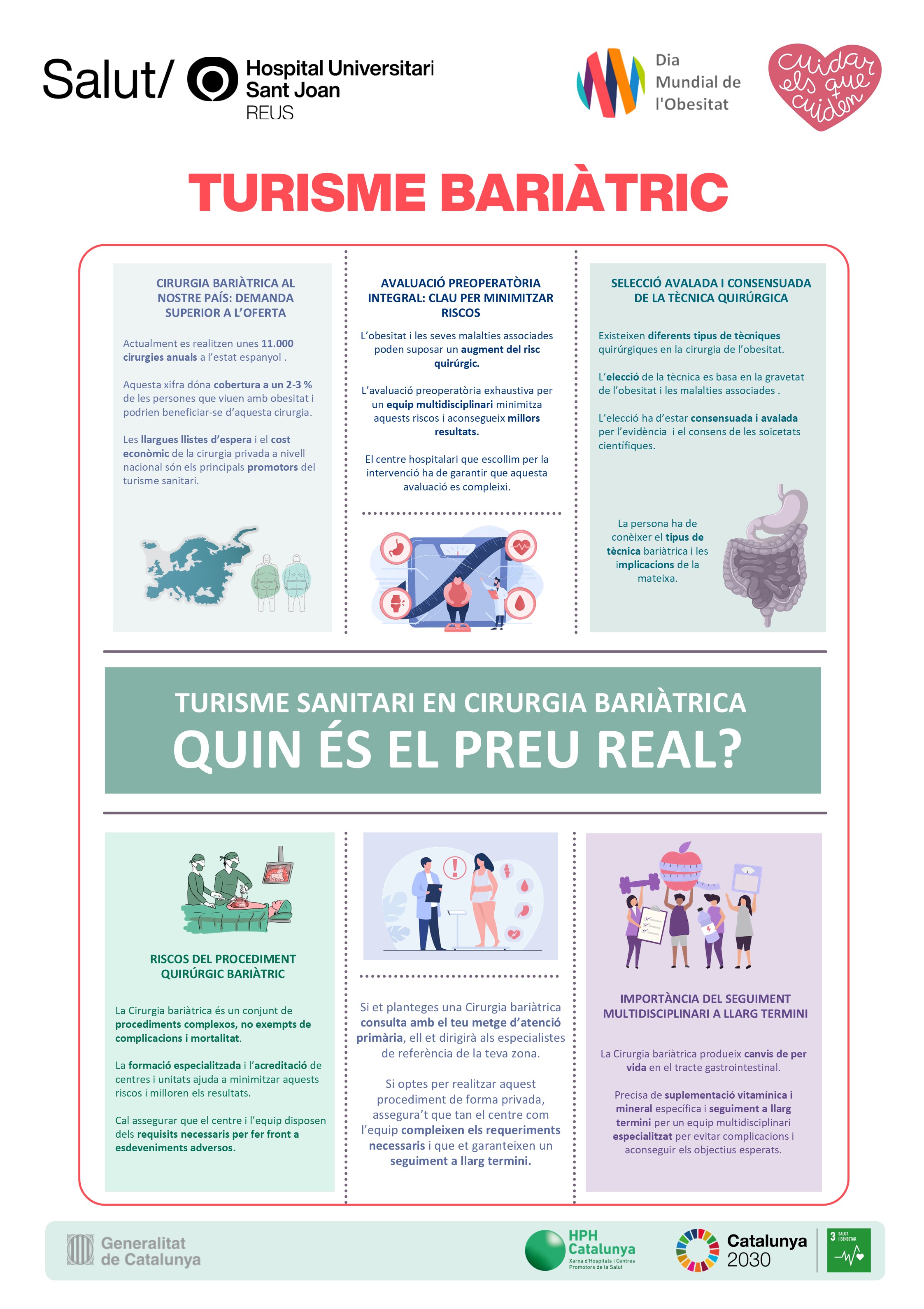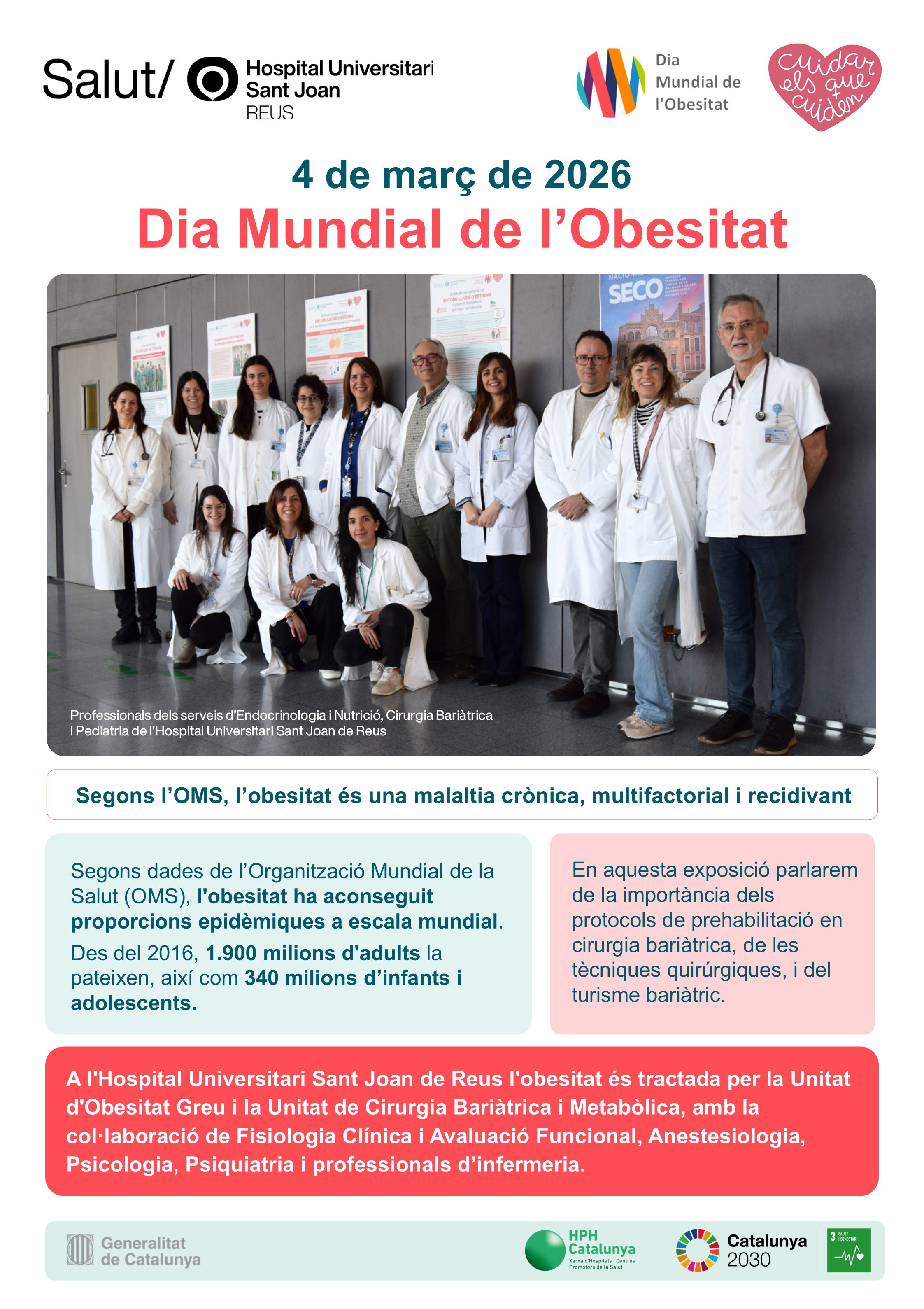 I és que segons dades de l'Organització Mundial de la Salut (OMS), l'obesitat ha aconseguit proporcions epidèmiques a escala mundial. Des del 2016, 1.900 milions d'adults la pateixen, així com 340 milions d'infants i adolescents. A l'Hospital Universitari Sant Joan de Reus l'obesitat és tractada per la Unitat d'Obesitat Greu i la Unitat de Cirurgia Bariàtrica i Metabòlica, amb la col·laboració de Fisiologia Clínica i Avaluació Funcional, Anestesiologia, Psicologia, Psiquiatria i professionals d'infermeria.