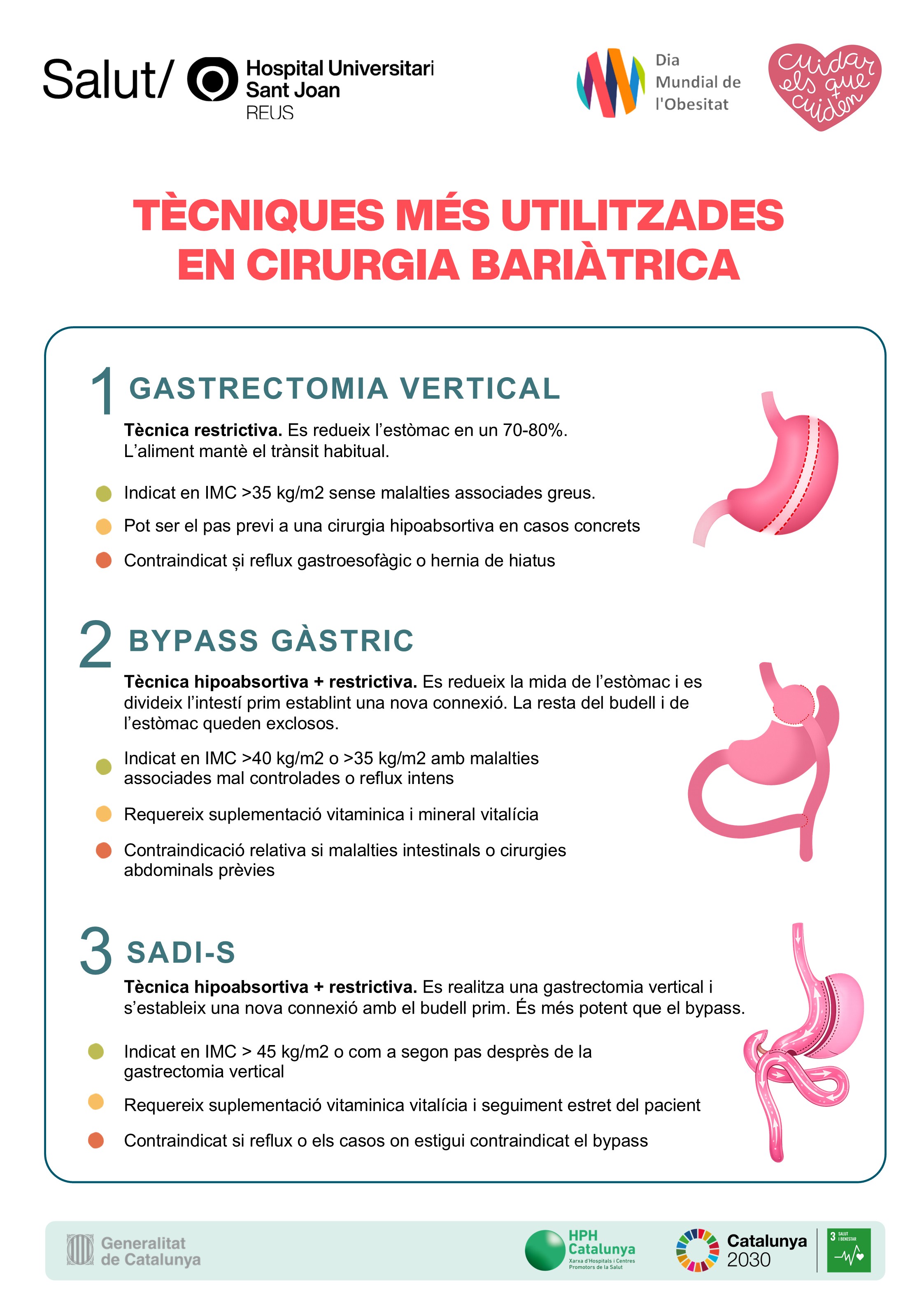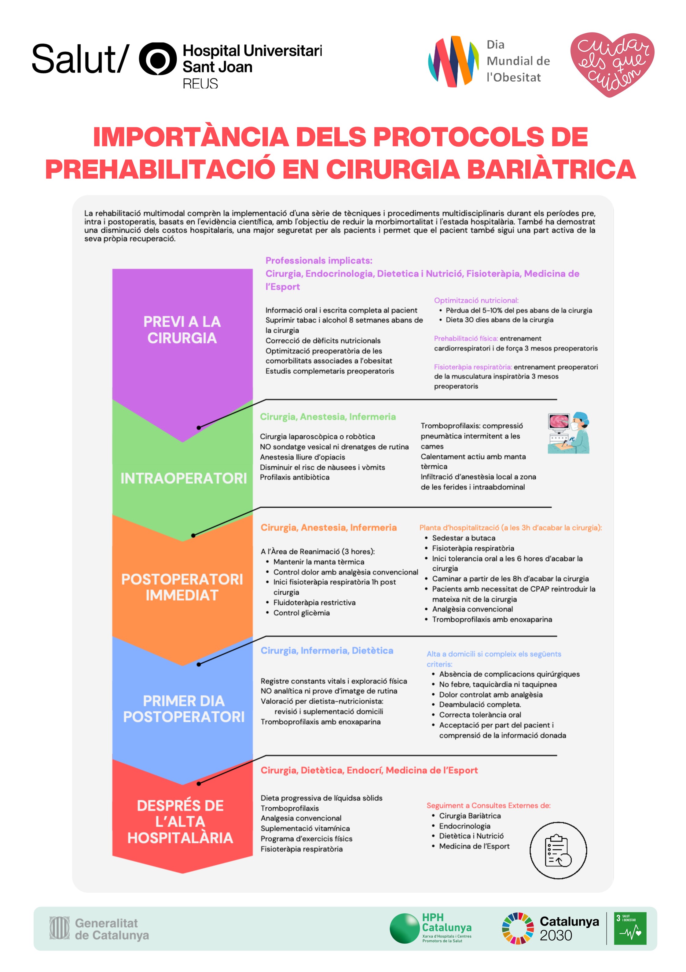 Segons l'OMS, l'obesitat és una malaltia crònica, multifactorial i recidivant. Per aquest motiu en el Dia Mundial de l'Obesitat (4 de febrer), els professionals dels serveis d'Endocrinologia i Nutrició, Cirurgia Bariàtrica i Pediatria de l'Hospital Universitari Sant Joan de Reus han preparat una exposició que tracta la importància dels protocols de prehabilitació en cirurgia bariàtrica, de les tècniques quirúrgiques, i del turisme bariàtric.