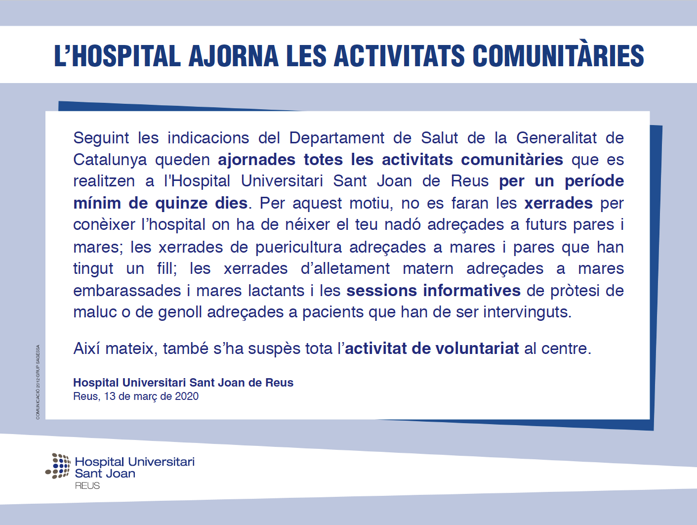 Seguint les indicacions del Departament de Salut de la Generalitat de Catalunya queden ajornades totes les activitats comunitàries que es realitzen a l'Hospital Universitari Sant Joan de Reus per un període mínim de quinze dies. Per aquest motiu, no es faran les xerrades per conèixer l’hospital on ha de néixer el teu nadó adreçades a futurs pares i mares; les xerrades de puericultura adreçades a mares i pares que han tingut un fill; les xerrades d’alletament matern adreçades a mares embarassades i mares lactants i les sessions informatives de pròtesi de maluc o de genoll adreçades a pacients que han de ser intervinguts.