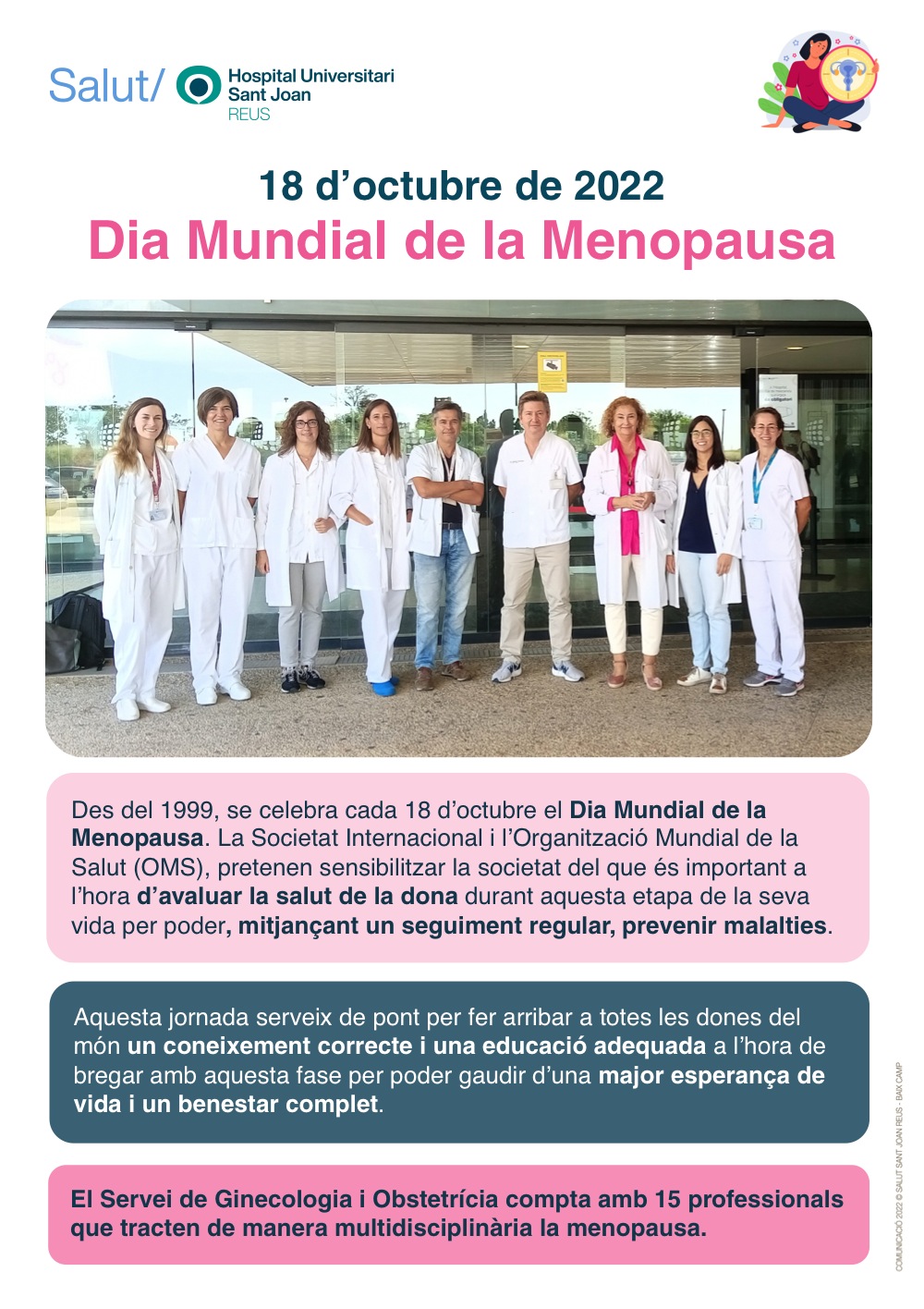 Coincidint amb la celebració del Dia Mundial de la Menopausa, l'Hospital Universitari Sant Joan de Reus fa difusió, a través de diversos plafons informatius, d'aquesta commemoració per sensibilitzar la societat del que és important a l'hora d'avaluar la salut de la dona durant aquesta etapa de la seva vida per poder, mitjançant un seguiment regular, prevenir malalties. Concretament, a través de diverses il·lustracions i textos s'explica què és la menopausa, quan es produeix, perquè es produeix i quins són i com es poden millorar els símptomes.