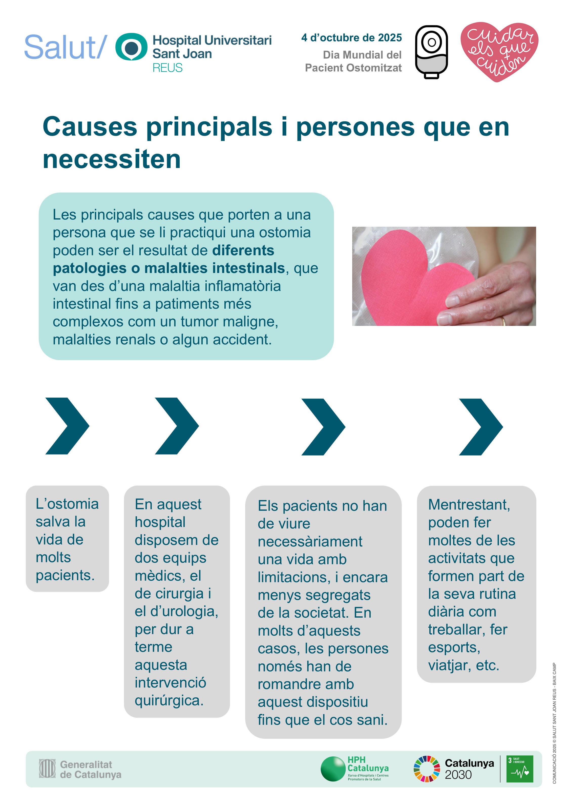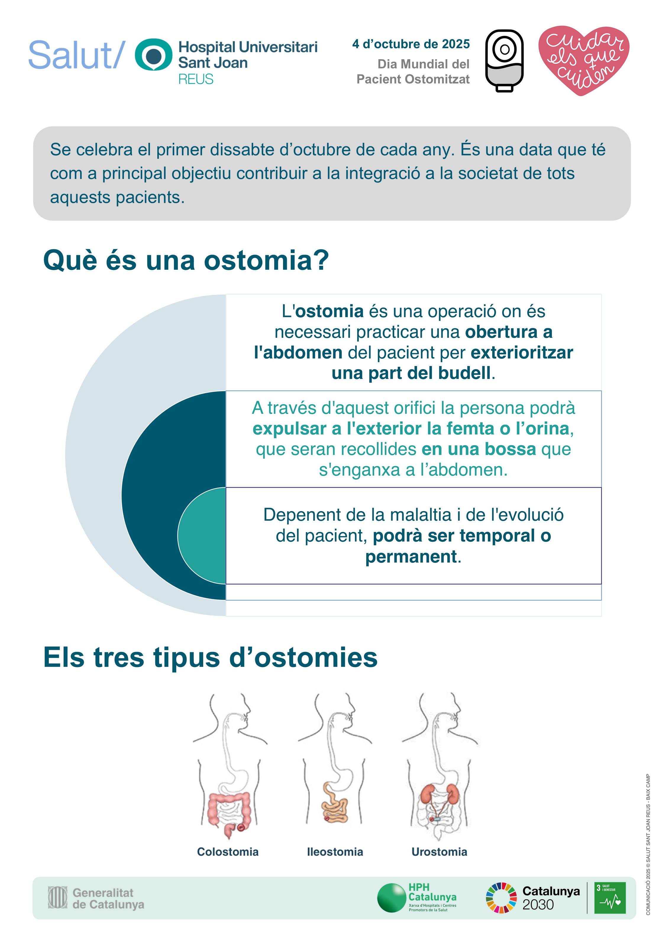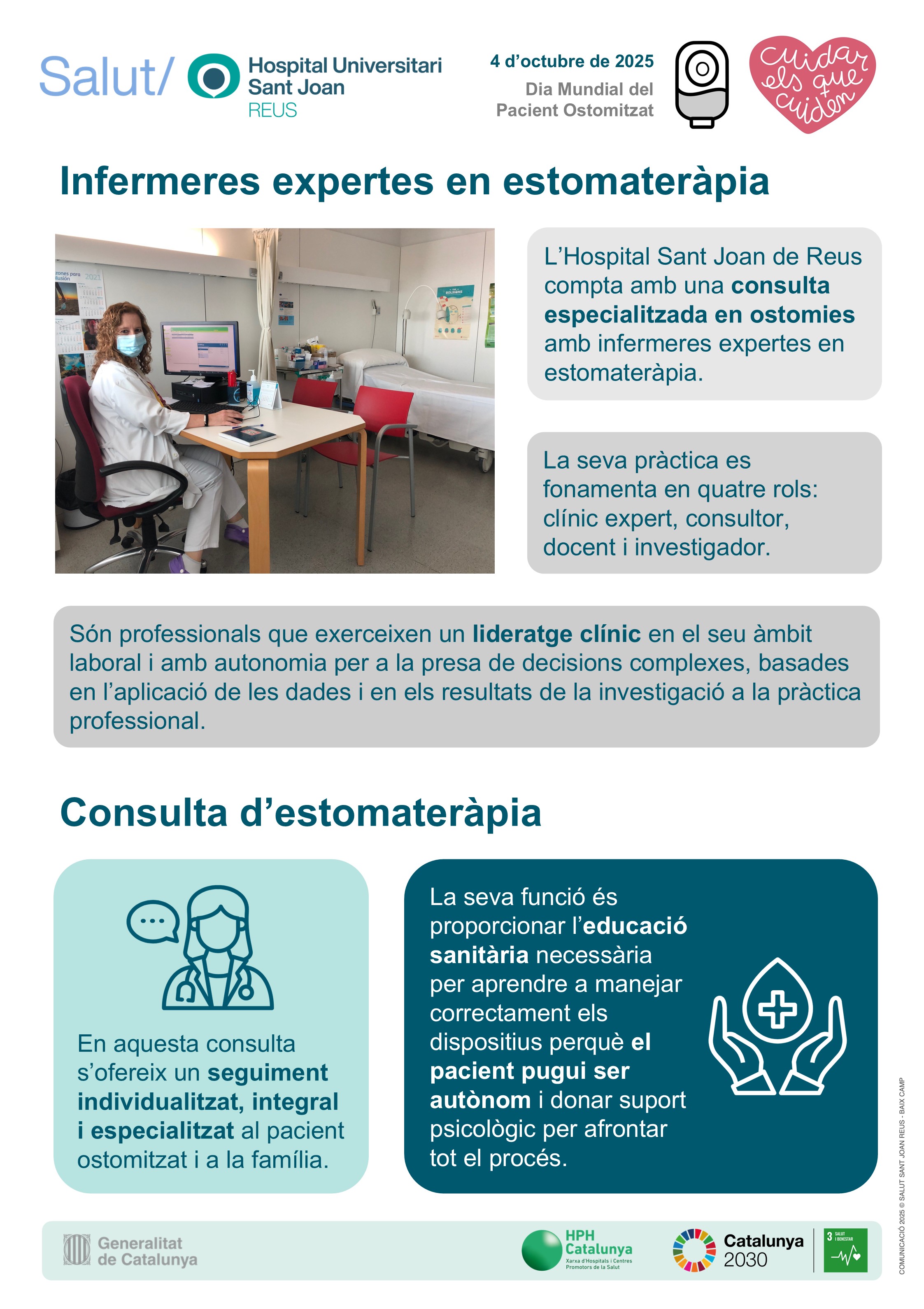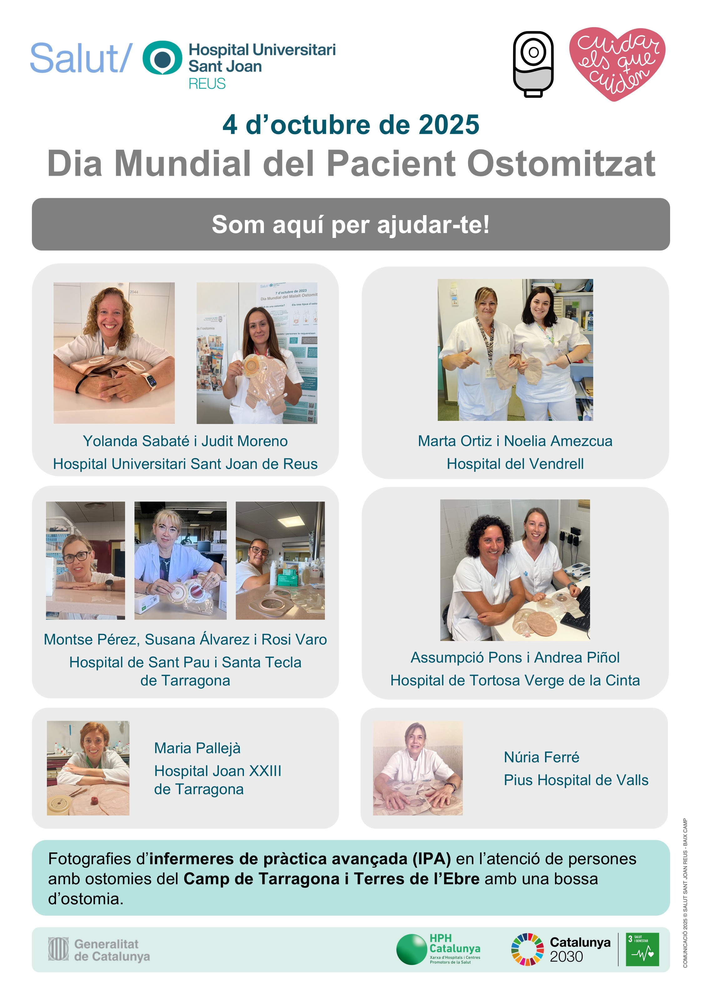 El Dia Mundial del Pacient Ostomitzat (4 d'octubre) se celebra el primer dissabte d'octubre de cada any i té com a principal objectiu contribuir a la integració a la societat de tots aquests pacients. L'equip de l'Hospital Universitari Sant Joan de Reus ha preparat uns pòsters expositius on, a més d'explicar en què consisteix aquesta pràctica, que salva la vida als pacients, mostra les infermeres de pràctica avançada (IPA) en l'atenció de persones amb ostomies de tots els centres del Camp de Tarragona i Terres de l'Ebre. I és que el seu rol és clau perquè els pacients afrontin el procés.