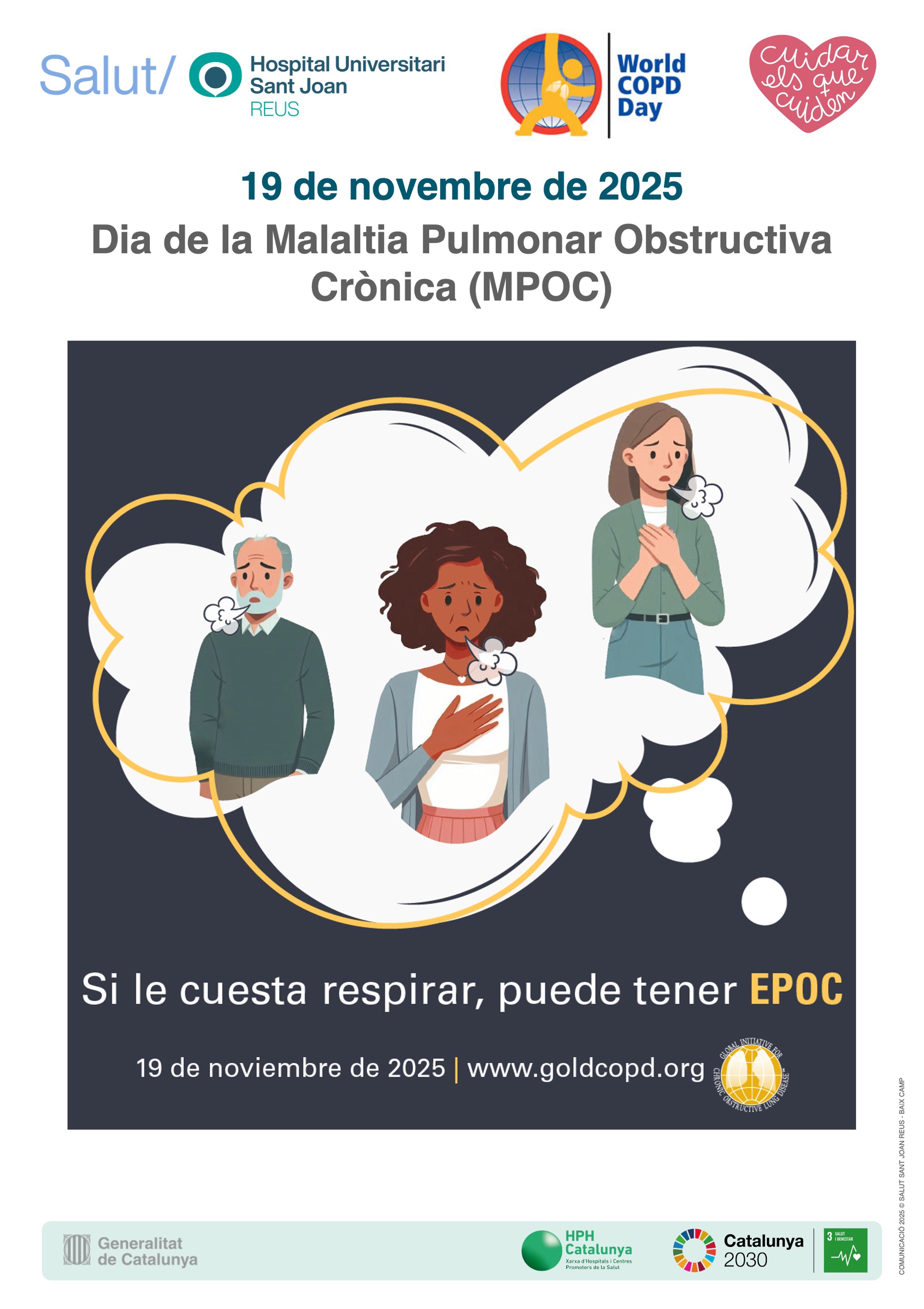 El Servei de Pneumologia de l'Hospital Universitari Sant Joan de Reus commemora avui el Dia Mundial de la Malaltia Pulmonar Obstructiva Crònica (MPOC) recordant que és una malaltia freqüent, prevenible i tractable. Aquesta acció, promoguda per Iniciativa Global per a l'MPOC (GOLD), ha escollit com a lema per aquest 2025 "Si tens dificultat per respirar, pensa en la MPOC" per emfatitzar que, tot i que la MPOC és la tercera causa de mort a tot el món, sovint no es diagnostica correctament. Un infradiagnòstic important i un diagnòstic erroni fan que els pacients no rebin tractament o un tractament incorrecte. Per contra, un diagnòstic precoç adequat de la MPOC pot tenir un impacte molt significatiu en la salut pública.