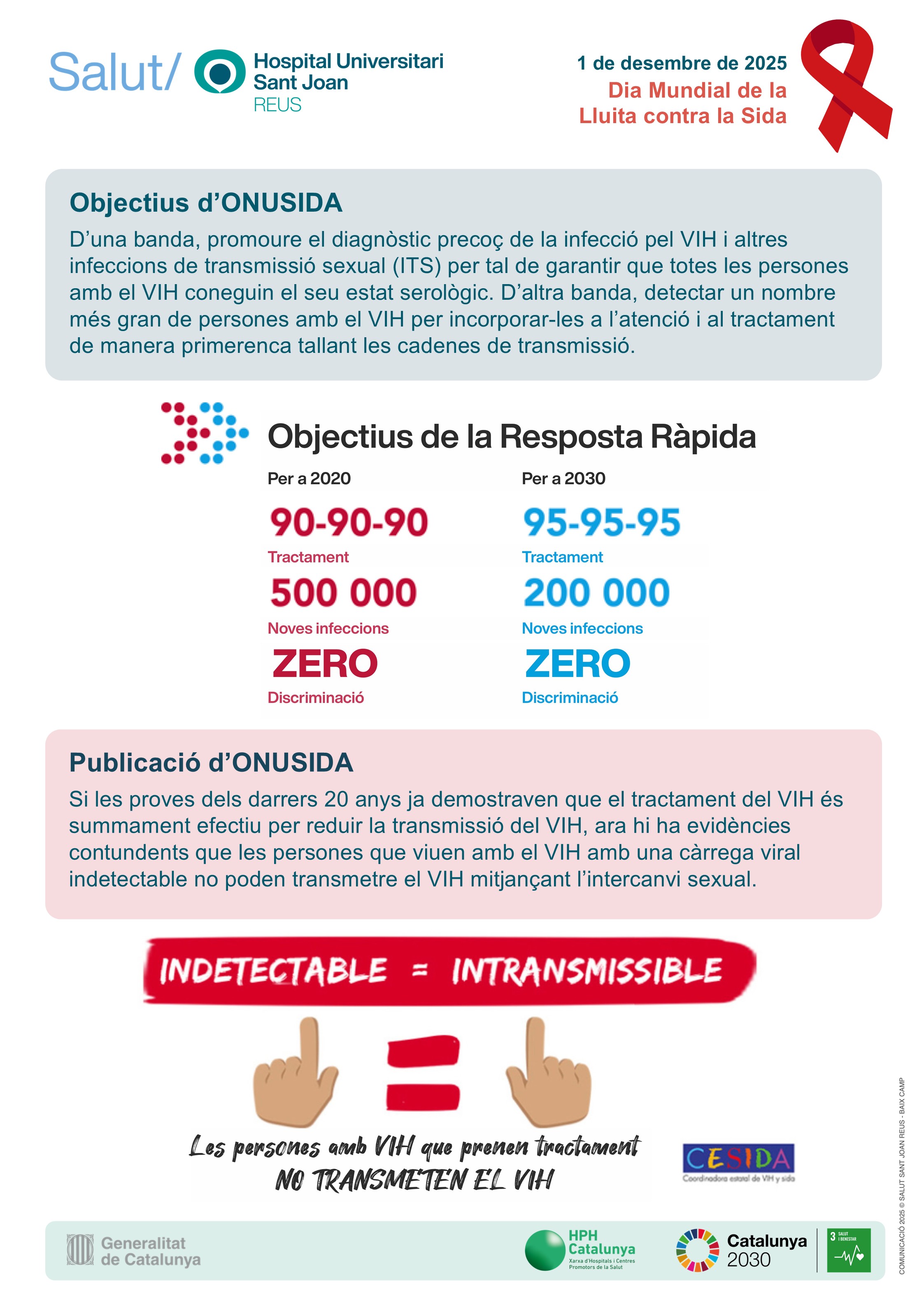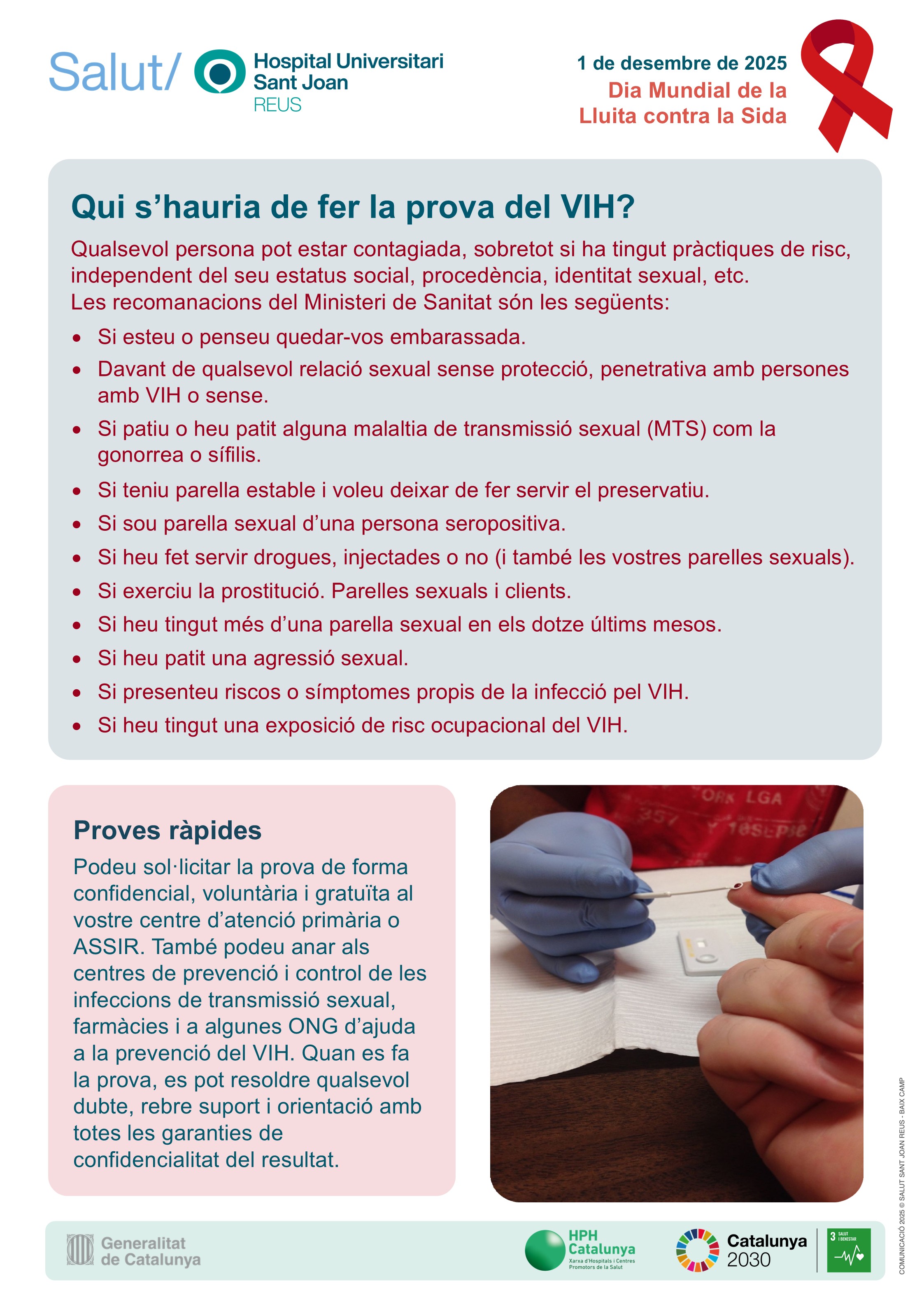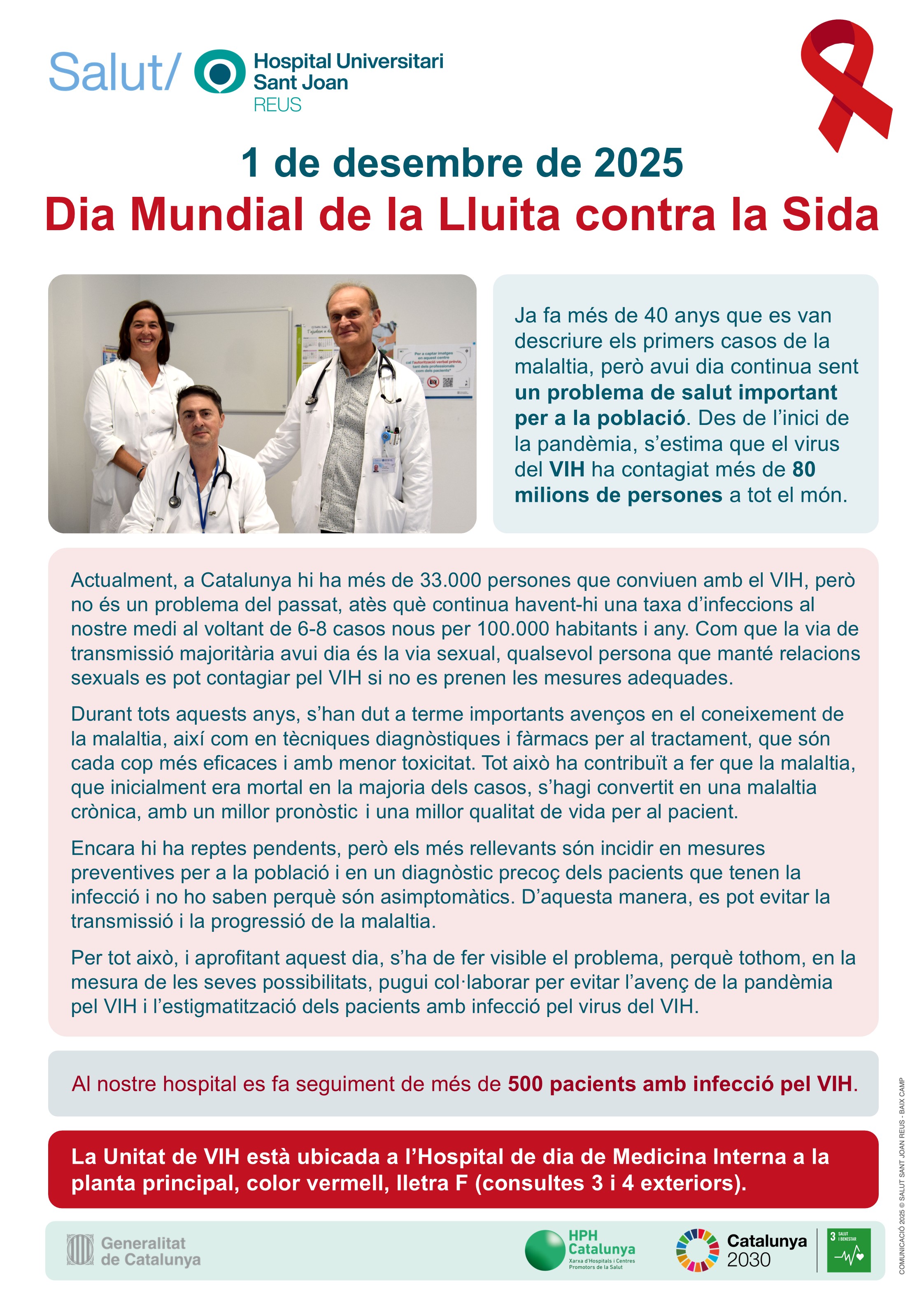 El dia 1 de desembre és el Dia Mundial de la Lluita contra la Sida. I per commemorar-lo, des de la Unitat de VIH de l'Hospital Universitari Sant Joan de Reus s'han preparat uns cartells informatius que estaran exposats a la rambla del centre durant uns dies.