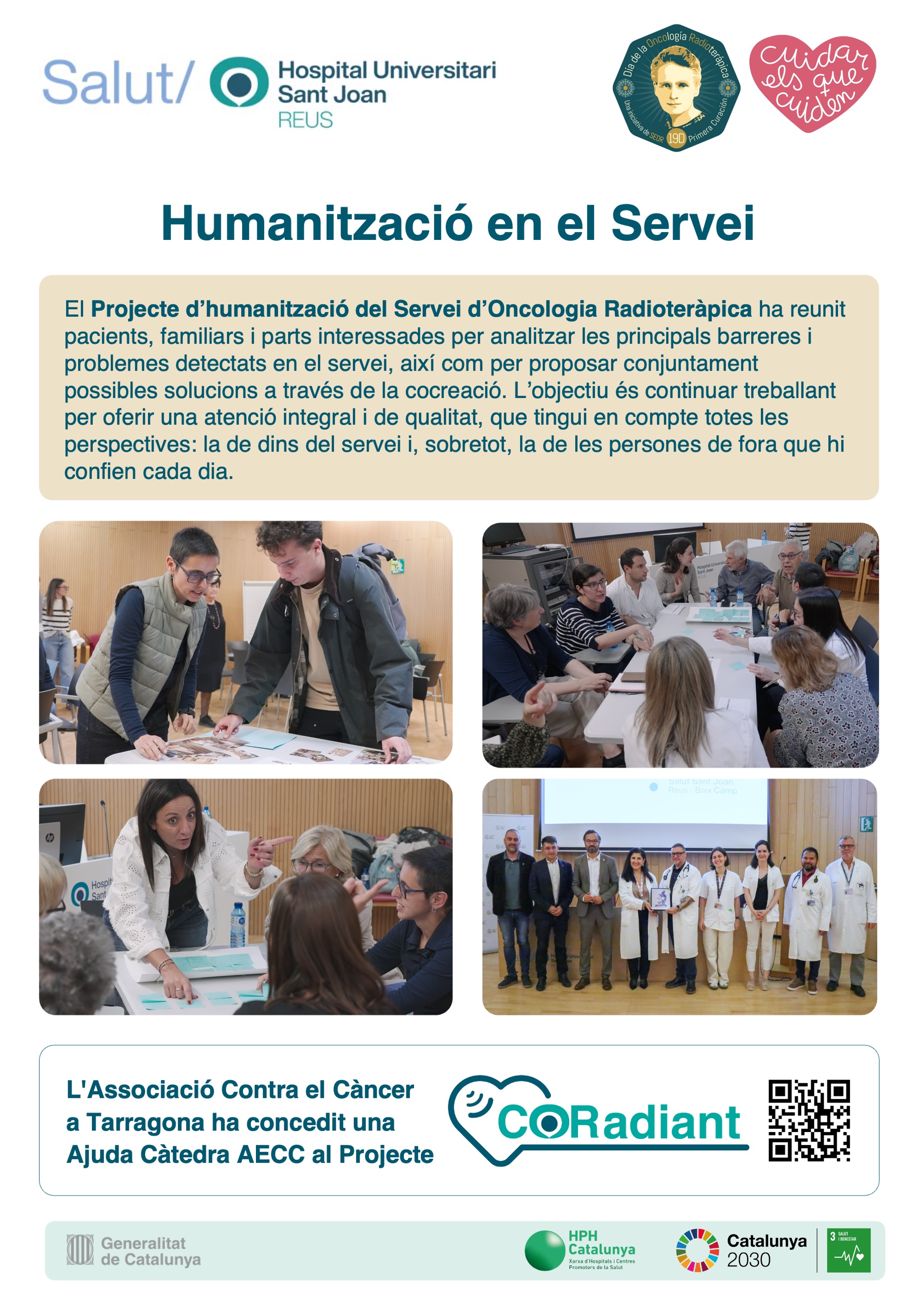 CORadiant és un Projecte d'humanització del Servei d'Oncologia Radioteràpica que ha reunit pacients, familiars i parts interessades per analitzar les principals barreres i problemes detectats en el servei. El projecte vol proposar conjuntament possibles solucions a través de la cocreació, i ha rebut una Ajuda Càtedra AECC de l'Associació Contra el Càncer a Tarragona.