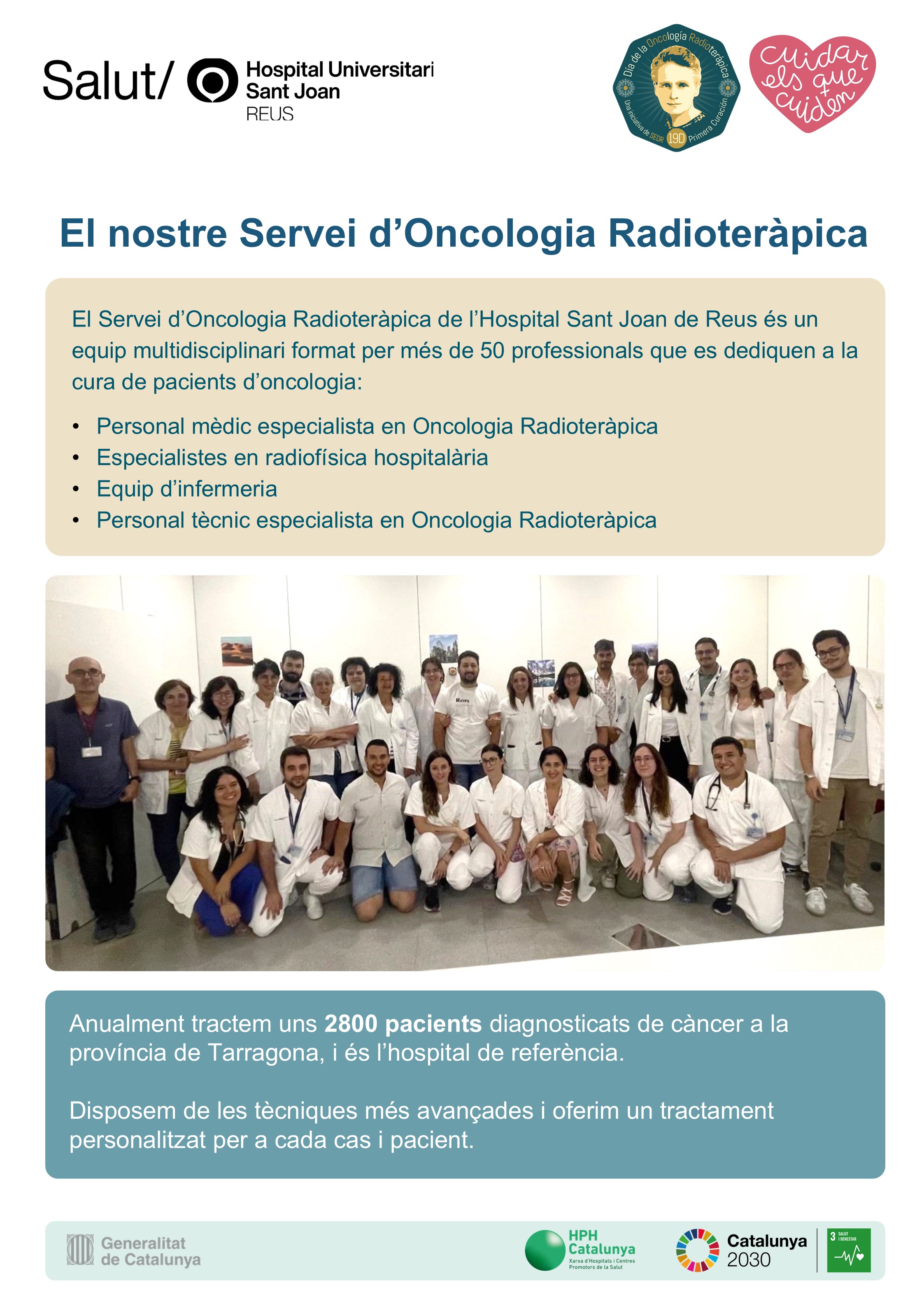 El Servei d'Oncologia Radioteràpica de l'Hospital Sant Joan de Reus (Zona A, color lila, planta -2), és un equip multidisciplinari format per més de 50 professionals que es dediquen a la cura de pacients d'oncologia: