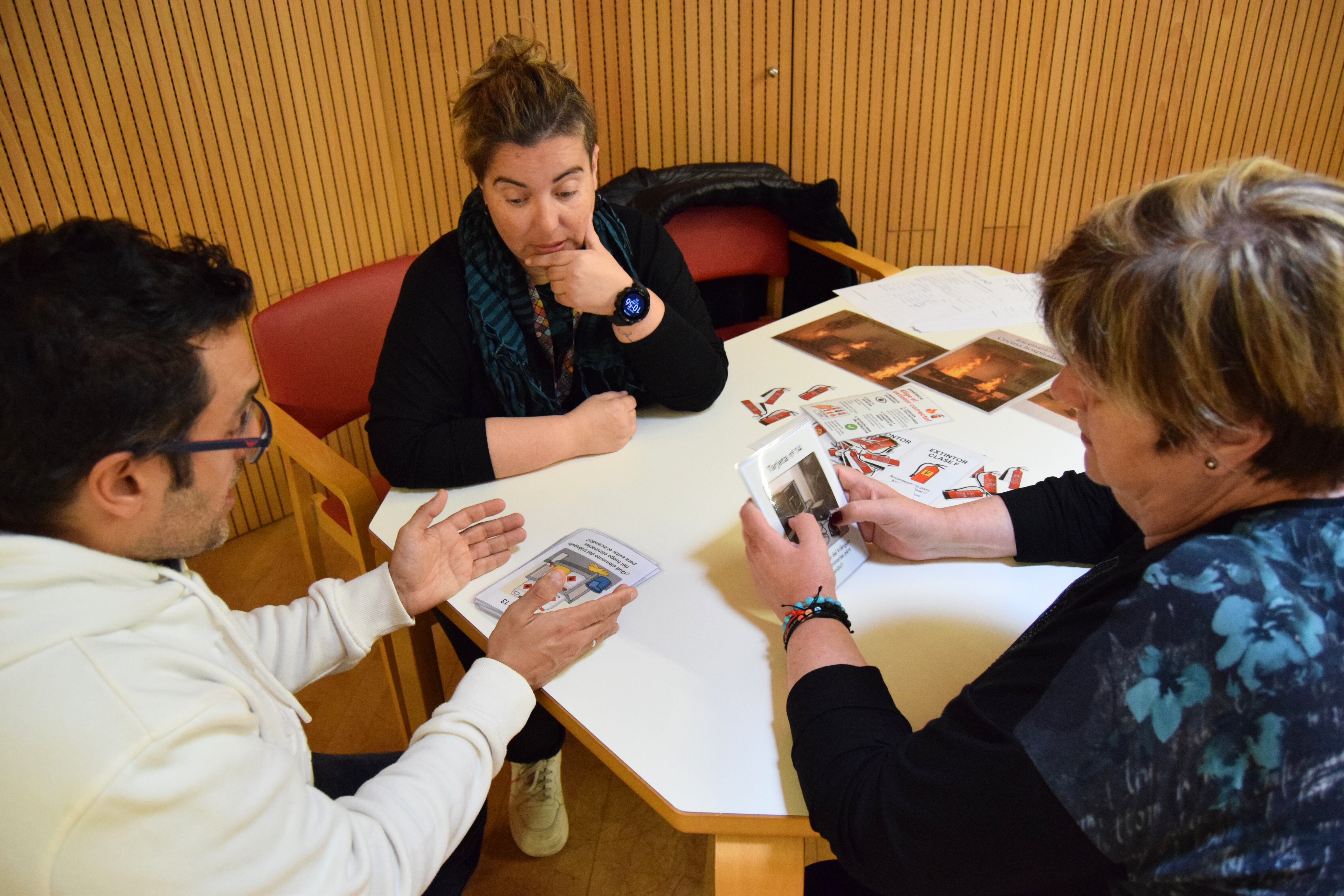 El taller es completa amb jocs de taula didàctics per reforçar els continguts teòrics, basats en escenaris generats per intel·ligència virtual, així com amb una simulació d'evacuació amb visibilitat nul·la provocada pel fum d'un incendi en una sala totalment fosca.
