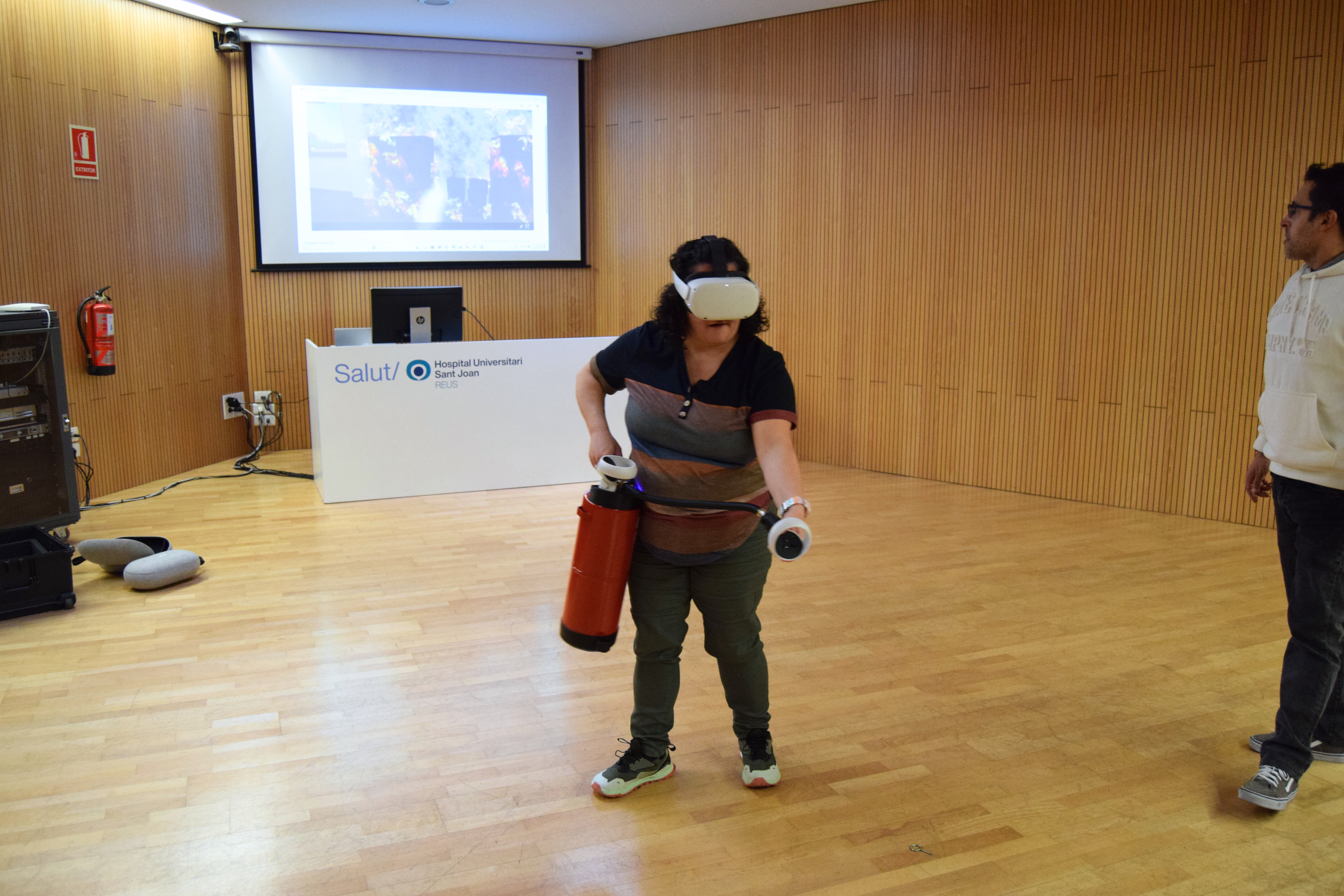 Avui dimarts, 3 de febrer, han començat les sessions formatives d'extinció d'incendis amb realitat virtual adreçades als professionals de Salut Sant Joan Reus-Baix Camp. Durant les formacions, les persones participants han pogut practicar com apagar un incendi fictici utilitzant un extintor real combinat amb ulleres de realitat virtual.
