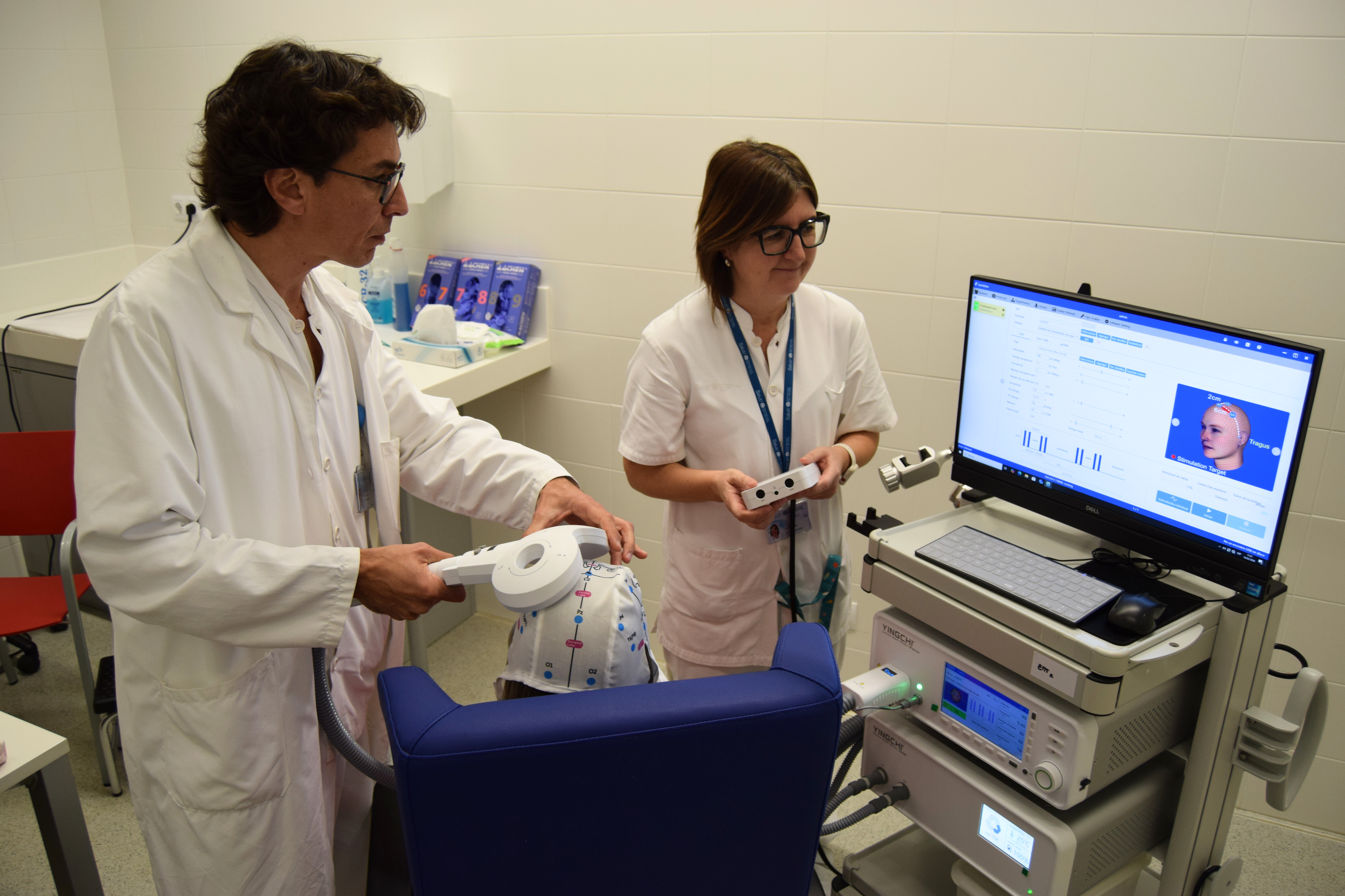 Preparació d’un tractament de neuromodulació amb estimulació magnètica transcraneal repetitiva (rTMS).